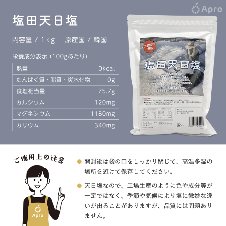 天日塩ですので、工場生産のように色や成分等が一定ではなく、季節や気候により塩に微妙な違いがでることがありますが、品質には問題ありません。