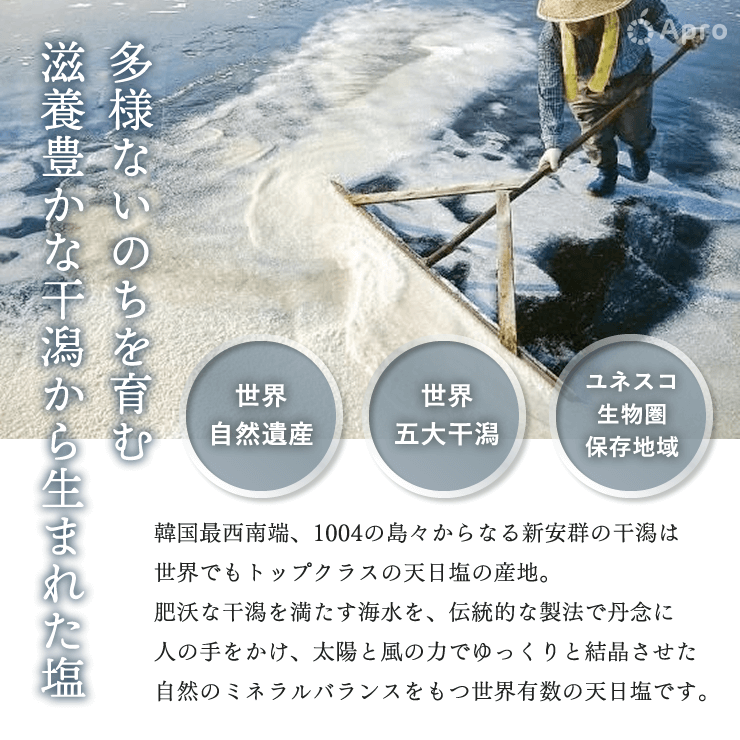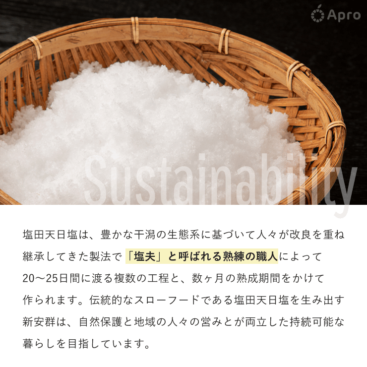 自然豊かな干潟の海水を太陽と風の力で時間をかけて結晶させた、自然のミネラルバランスをもつ塩田塩です。