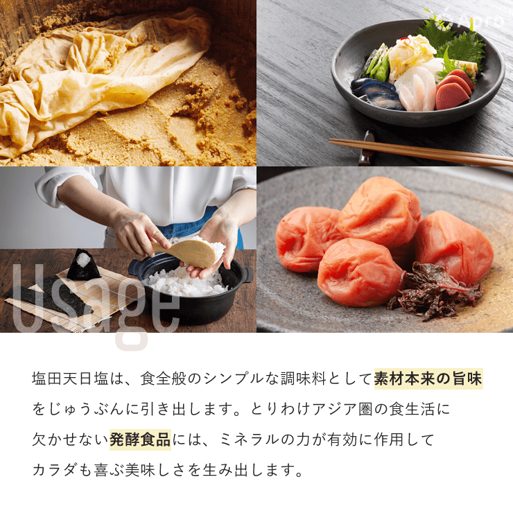 伝統ある塩田だからこそ生み出せる自然の力が、グルメの調味料として、自家製味噌や漬け物の発酵の力と豊かな旨さを充分に引き出します。