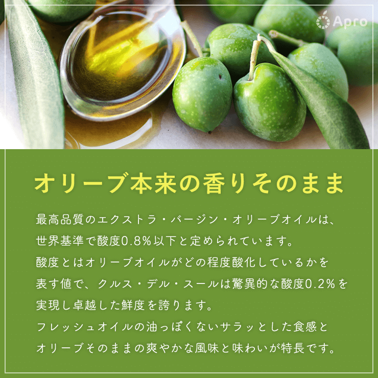 世界基準は100gに対して酸度は0.8%以下のものだけが、品質の良い「エキストラバージン」と決められています。クルス・デル・スールの品質を表す上で重要な「酸度」は、なんと「0.2%」!