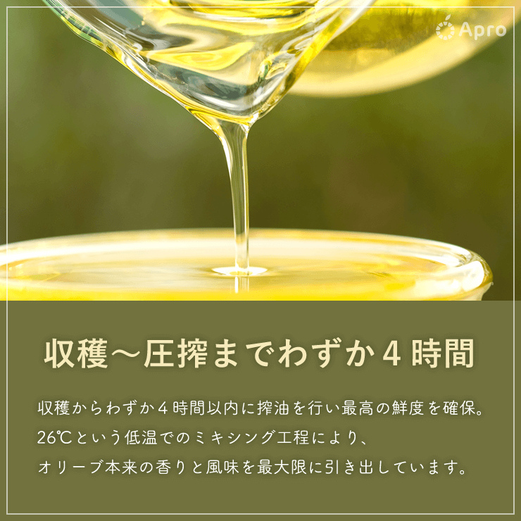 エクストラ・バージン・オリーブオイルの世界基準は酸度0.8%以下、低いほどフレッシュです。収穫からわずか4時間で絞るこのオイルは酸度0.2%。新鮮なハーブの香り、見事なグリーンゴールド、上質なコクが特徴です。