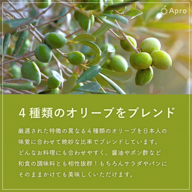 4種類のオリーブが持つ特長を活かし、絶妙な比率でブレンドしています。