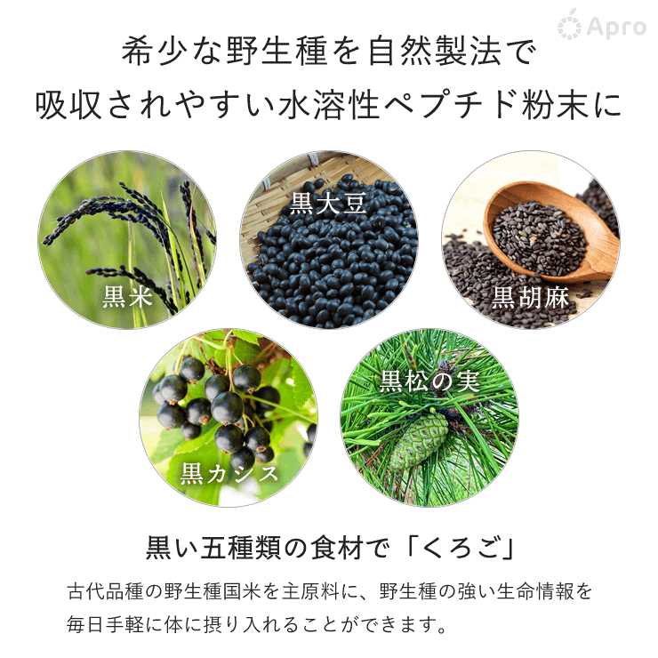 「古代食くろご・ペプチド」の主原料は古代のままの品種である野生種の黒米を主としています。古代人が食べていた希少な野生種が気象学を応用した自然製法によって現代人にも吸収されやすい水溶性ペプチド粉末に進化しました。お湯か水に溶かして飲むだけで美味しく頂けますので、忙しい朝の朝食代わりや、体調を整える副食にもなります。溶かして飲む香ばしい飲み物ですので 「古代食くろご・ペプチド」を毎日ご愛飲いただけば野生種の強い生命情報を一日一度、体に摂り入れることができます。心身とも野生の生命力を取り戻す飲み物です。