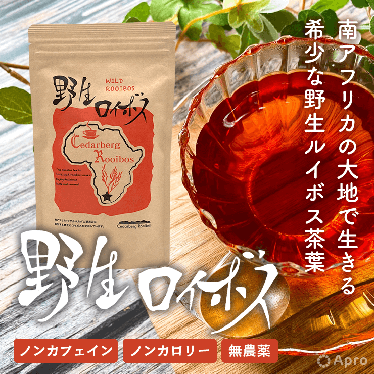 「野生ロイボス」は、セダルバーグ 山脈周辺に自生する野生のルイボスの葉のみを使用しています。日本国内で流通しているルイボスティーの原料は、ほとんどが人工栽培されたもの。この「野生ロイボス」は、野生ルイボス茶葉100%です。