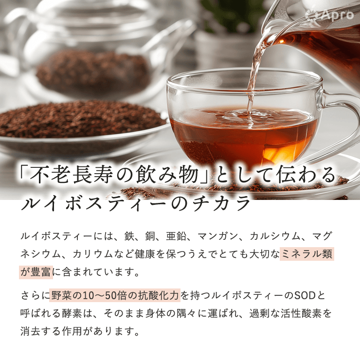ルイボスティーには、野菜の10〜50倍の抗酸化力があります。