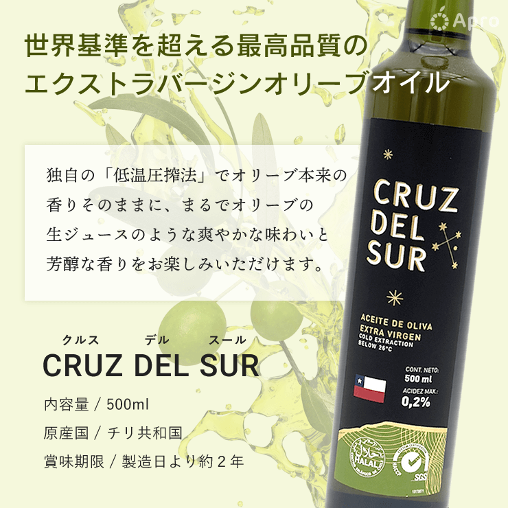 世界基準は100gに対して酸度は0.8%以下のものだけが、品質の良い「エキストラバージン」と決められています。クルス・デル・スールの品質を表す上で重要な「酸度」は、なんと「0.2%」!