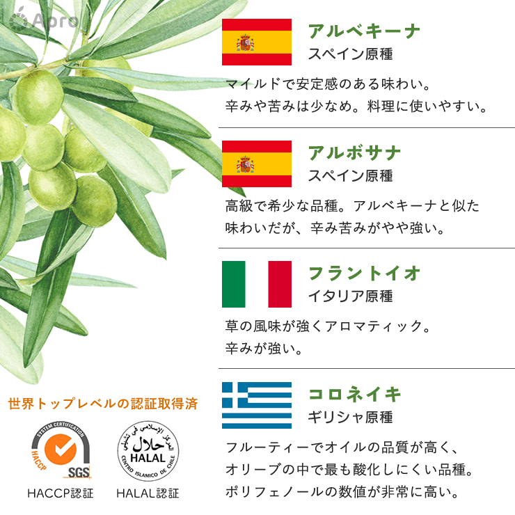4種類のオリーブが持つ特長を活かし、絶妙な比率でブレンドしています。