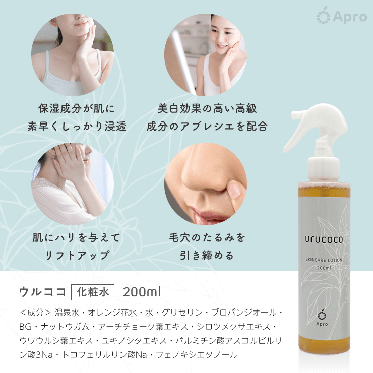 【成分】温泉水・オレンジ花水・水・グリセリン・プロパンジオール・BG・ナットウガム・アーチチョーク葉エキス・シロツメクサエキス・ウワウルシ葉エキス・ユキノシタエキス・パルミチン酸アスコルビルリン酸3Na・トコフェリルリン酸Na・フェノキシエタノール