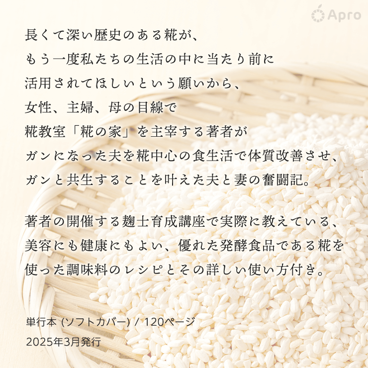 長くて深い歴史のある糀が、もう一度私たちの生活の中に、当たり前に活用されてほしいという願いから、女性、主婦、母の目線で糀教室「糀の家」を主宰する著者が、ガンになった夫を糀中心の食生活で体質改善させ、ガンと共生することを叶えた夫と妻の奮闘記。著者の開催する麹士育成講座で実際に教えている、美容にも健康にもよい、優れた発酵食品である糀を使った調味料のレシピとその詳しい使い方付き。