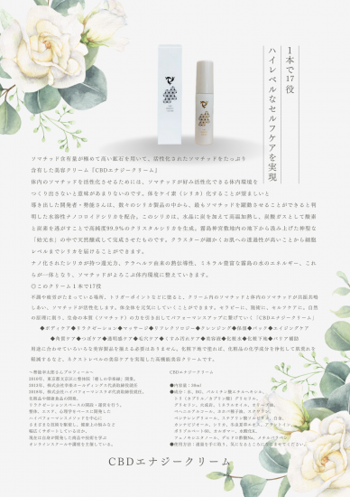ステアリン酸ソルビタン、カンナビジオール、シリカ、金、アラントイン、冬虫夏草エキス、