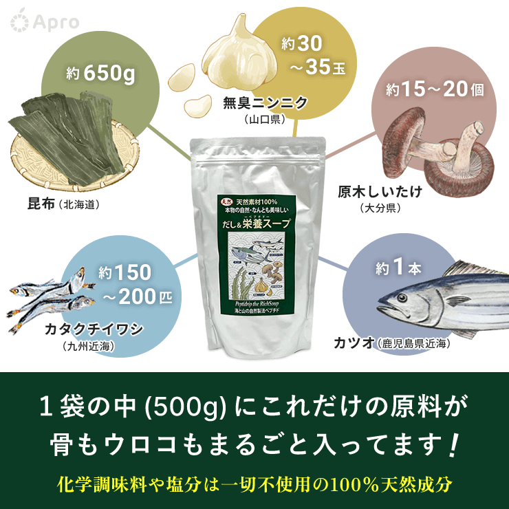 澱粉分解物(キャッサバ芋・タイ)カタクチイワシ(福岡・長崎県近海)カツオ(鹿児島県近海)昆布(北海道) 原木栽培椎茸(大分県)無臭ニンニク(山口県)
