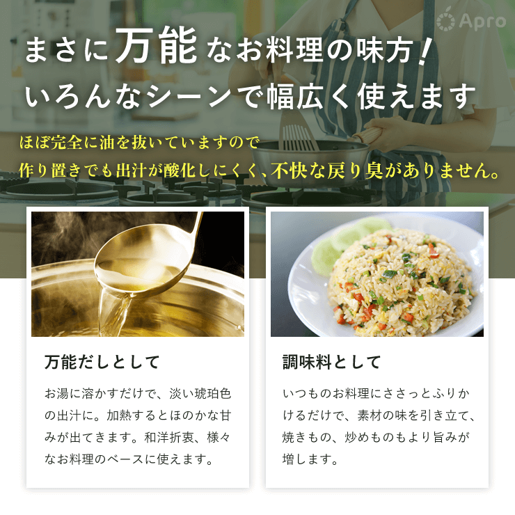 ●加熱するとほのかな甘みが出てまいりますので和洋中華、創作料理、種類を選ばない出汁として使えます。