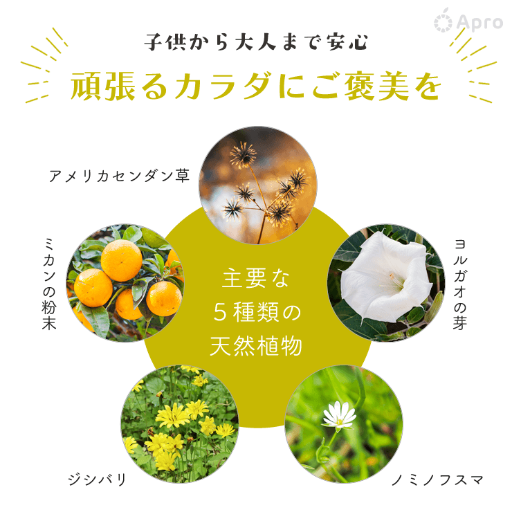 アメリカセンダン草(キク科)、ミカンの粉末(ミカン科)、ヨルガオの芽末(ヒルガオ科)、ジシバリ粉末(キク科)、ノミノフスマ末(ナデシコ科)、キンセンレン(ラン科)、パイナップル果汁粉飴、乳糖、デキストリン、ショ糖エステル